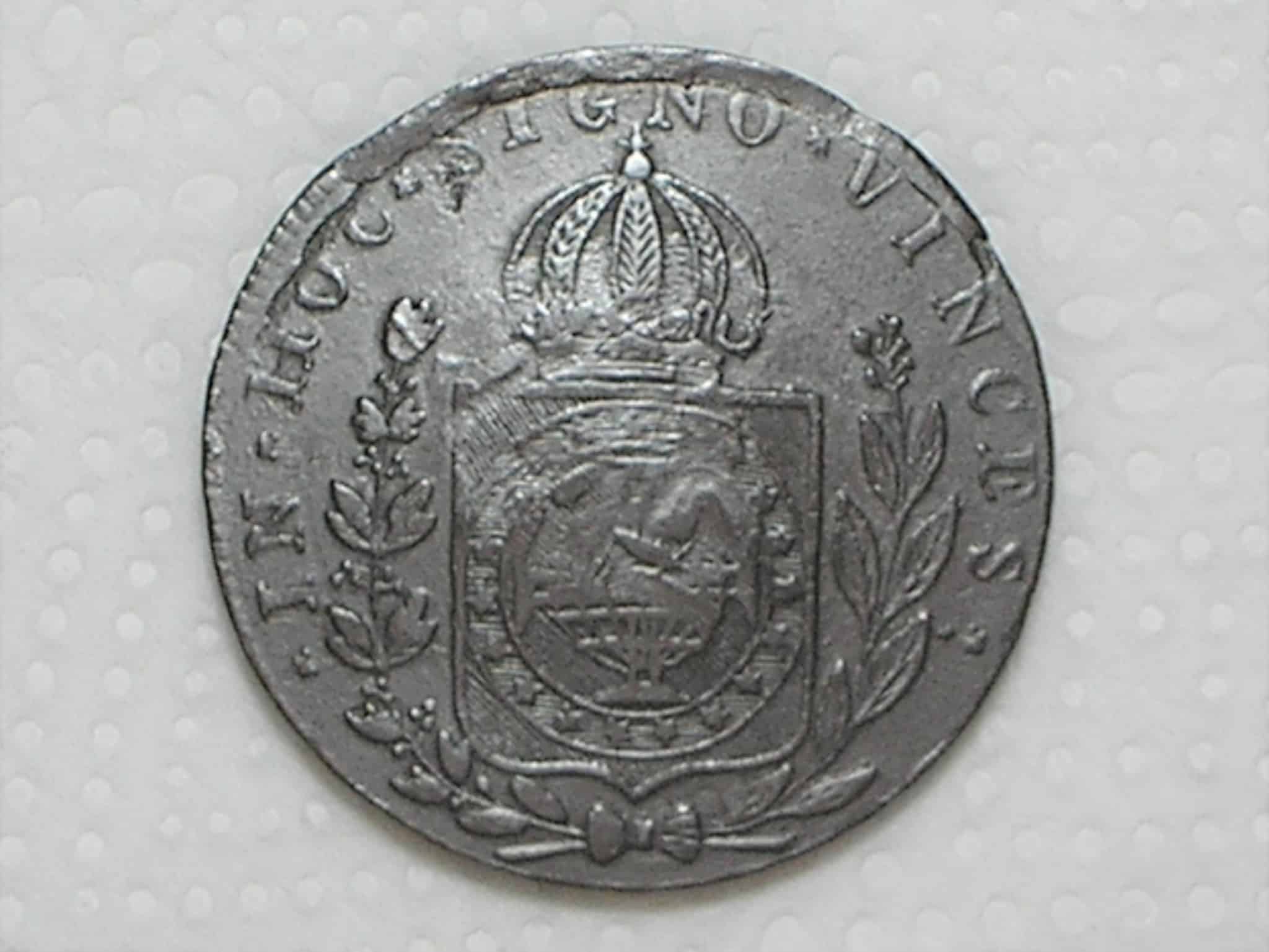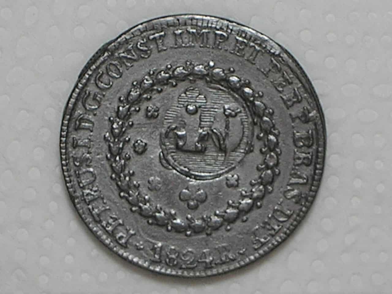 Especificação: 80 Réis – 1824 Rio = 27 Tulipas / Florões Verticais / Carimbo 40 / Império D. Pedro I / Cobre / Mbc / Box24
