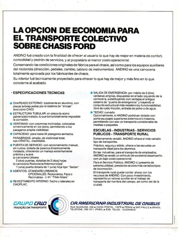 Especificação: Folder Propaganda Micro Onibus Jaragua Andino sobre Chassis Ford – Caio – Anos 70 / 80