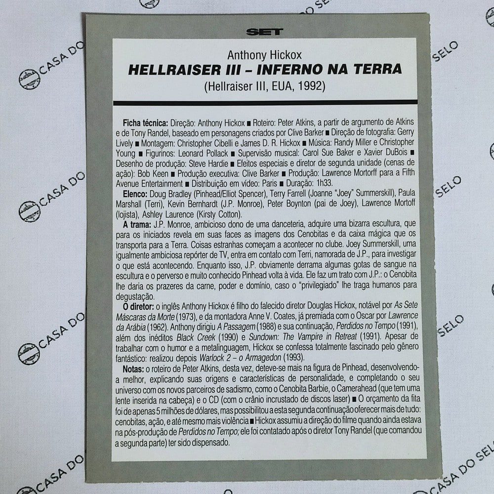 Especificação: Hellraiser 3 – Inferno Na Terra (1992) – Ficha Técnica – SET-237