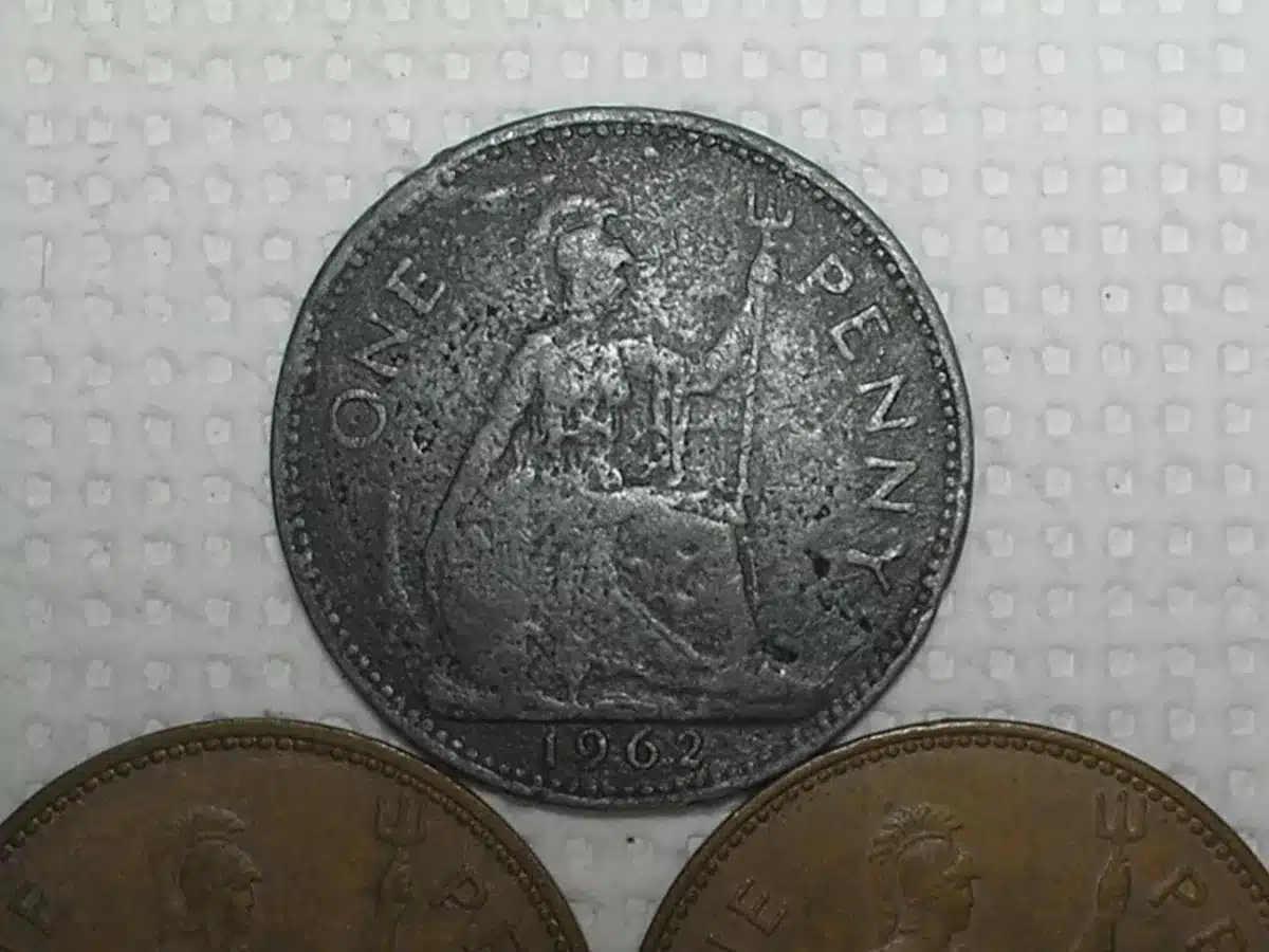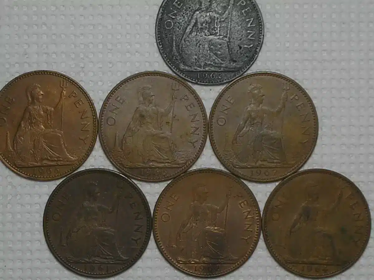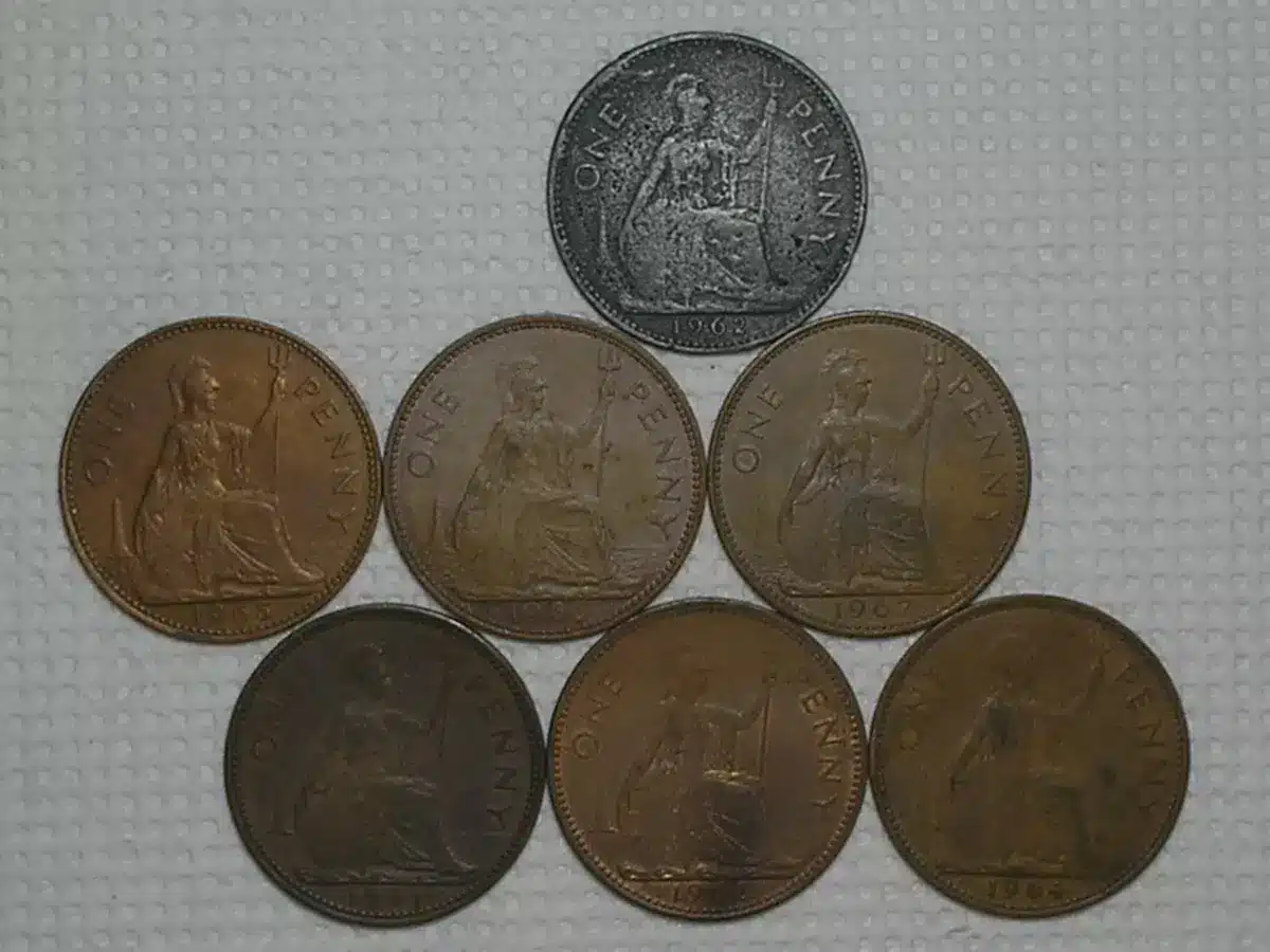 Inglaterra) 1 Penny – 1961 / 1962 / 1962-falsa da época / 1964 / 1965 / 1966 / 1967 – Bronze / m510