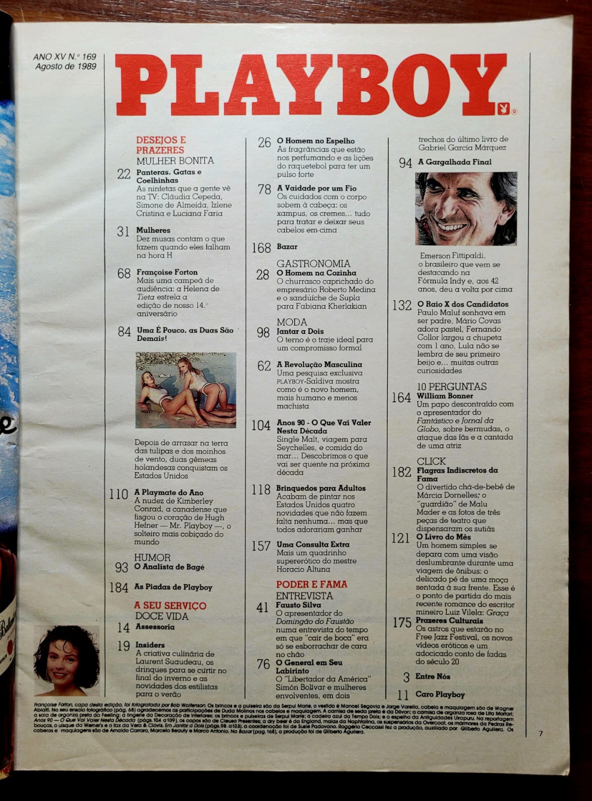 👉 Revistas Adultas — Clique aquiRevista Playboy Nº 169, de agosto de 1989, estrelada por Françoise Forton. Edição especial de 14º aniversário com pôster das gêmeas holandesas Miriam e Karin Van Breeschooten e matéria exclusiva sobre Emerson Fittipaldi. Um exemplar histórico e desejado pelos colecionadores!