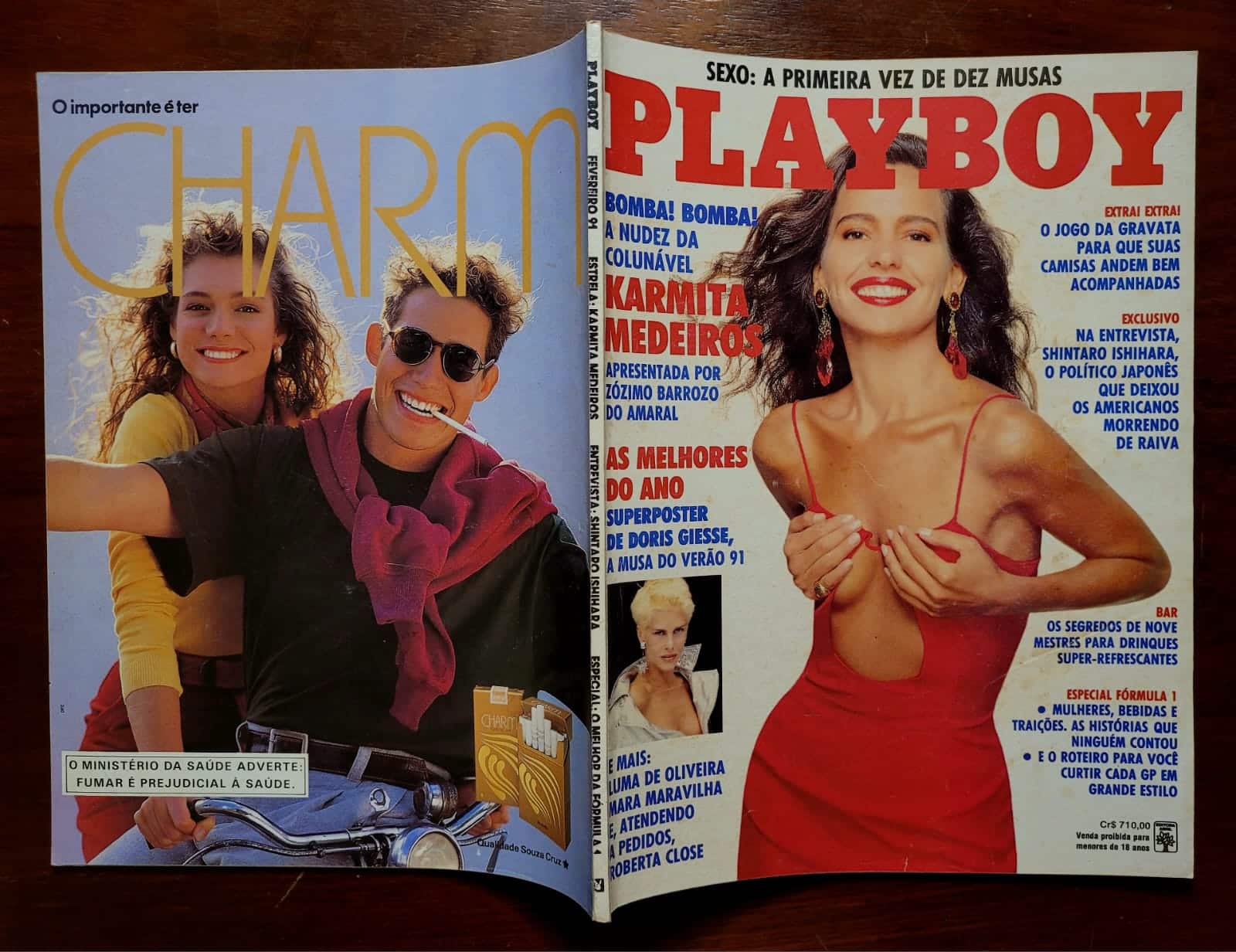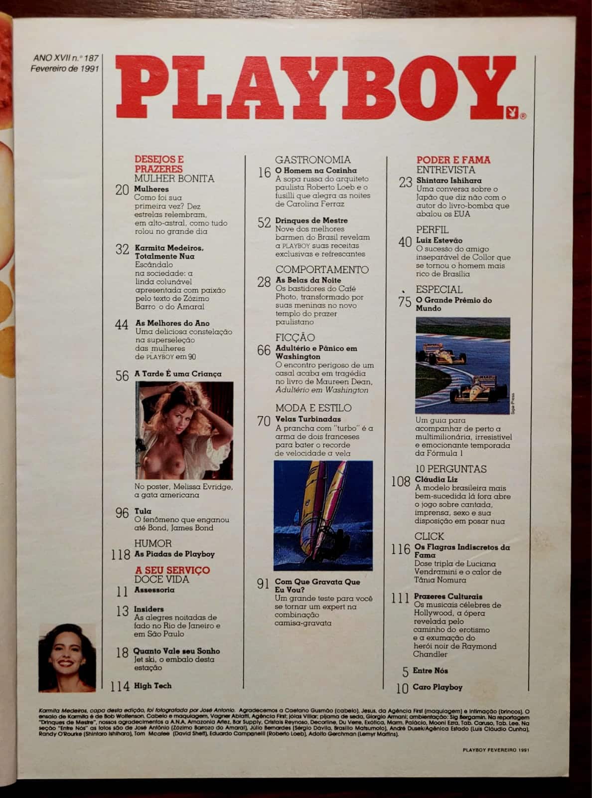 Playboy Fevereiro/1991 com Karmita Medeiros em ensaio ousado e superpôster de Doris Giesse. Pôster internacional com Melissa Evridge.