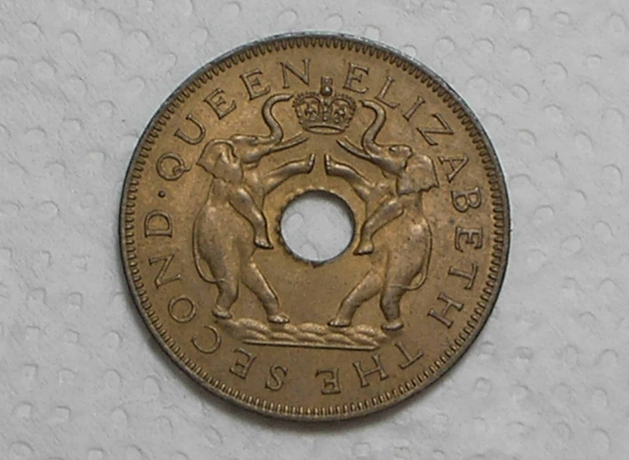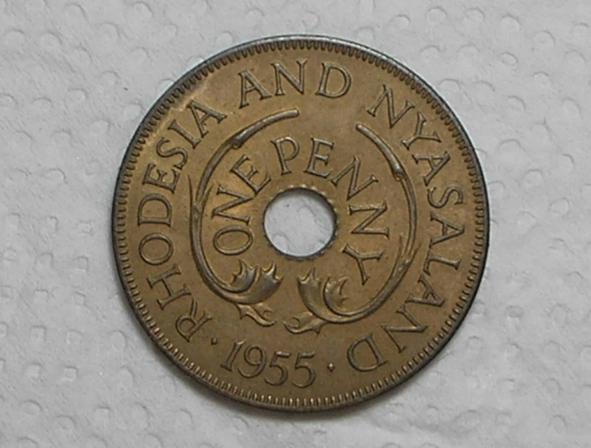 Rhodesia and Nyasaland) 1 Penny – 1955 / Primeira da série – escassa / Holed center / Queen Elisabeth / S/Fc / Bronze / box4